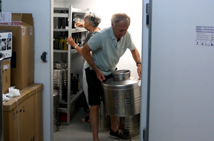 John – En effet, nous privilégions la qualité à la quantité. Nous attachons beaucoup d’importance à l’équilibre de nos assemblages. Et au-delà de la fabrication, nous sommes aussi très vigilants sur le stockage : l’huile est un produit qui, mal conservé, peut se détériorer très vite. Dès la sortie du moulin, nous plaçons l’huile dans des cuves inoxydables sous argon, un gaz inerte qui la préserve de l’oxydation, puis nous stockons ces cuves dans une chambre froide à 13°C. Nous ne conditionnons l’huile en bouteille et bidons qu’au gré des commandes. En gardant en tête qu’il faut tout de même la consommer le plus rapidement possible après sa fabrication.
