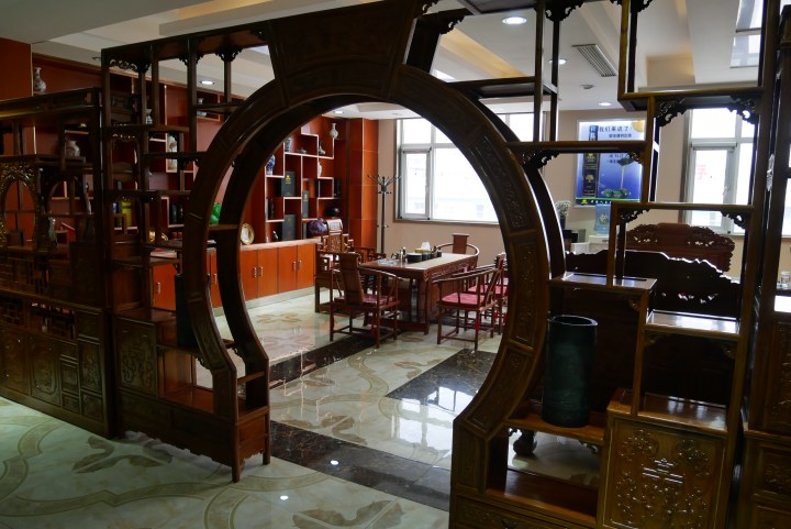 Among the 11 large olive oil companies in Wudu district (production >100 tons per year), we have an appointment this morning at Yu Sheng Kang, in a grim industrial area at the foot of the highway along the Bailong River. Very far from the peasant icon of olive oil, here we talk about factory, business and showroom, in a rather show-off setting. Interview with Mr. Pu, in carved wooden thrones.