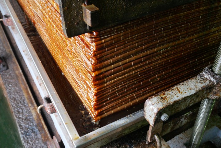 Katsuhisa-san – Après la seconde Guerre Mondiale, le gouvernement a souhaité relancer la culture de l’olivier sur Shōdoshima. Voyant l’essor de l’oléiculture, mon grand-père s’est lancé dans les années 1980, remplaçant alors des rizières par des oliveraies. Les terres arables de l’île n’étaient de toute façon pas suffisantes pour cultiver le soja et le blé nécessaires à la sauce soja, ingrédients que nous importons en réalité d’autres régions du Japon. Nous avons aujourd’hui 1800 oliviers et notre propre moulin. Selon les conditions climatiques de l’année nous récoltons 5 à 13 tonnes d’olives par an, dont nous extrayons 0,6 à 1,5 tonnes d’huile d’olive, que nous commercialisons localement, sous le label AOP de la préfecture de Kagawa, dont dépend Shōdoshima.