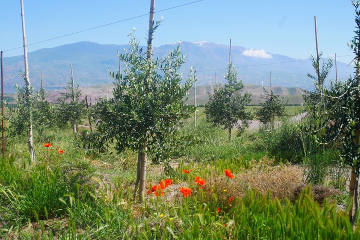 H.S. – Nous avons dans cette région beaucoup d’ensoleillement, des températures qui peuvent monter jusqu’à 40°C l’été mais descendent rarement sous 0°C l’hiver, très peu de précipitations – de l’ordre de 100mm par an en moyenne – et enfin beaucoup de vent. Tous les jours, le vent se lève en début d’après-midi et il n’est pas rare que les rafales dépassent les 100 km/h. Le gouvernement ne s’y est d’ailleurs pas trompé, et a installé ici une centaine d’éoliennes l’an dernier. Sur les conseils de nos amis grecs, nous avons quant à nous planté des rangées d’oliviers de la variété Zardr, très résistante, entre chaque parcelle qui serviront avant tout à protéger les autres arbres du vent.