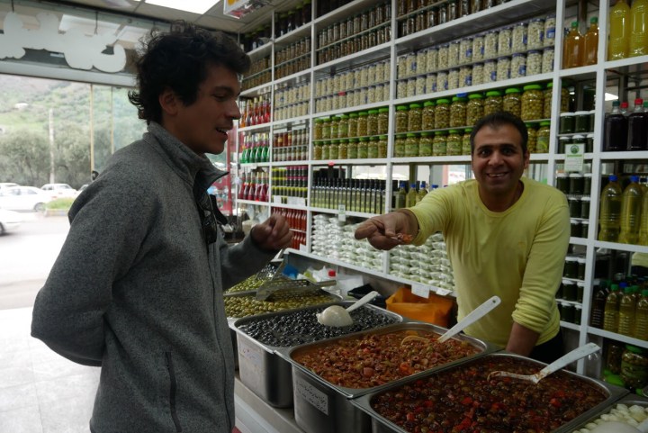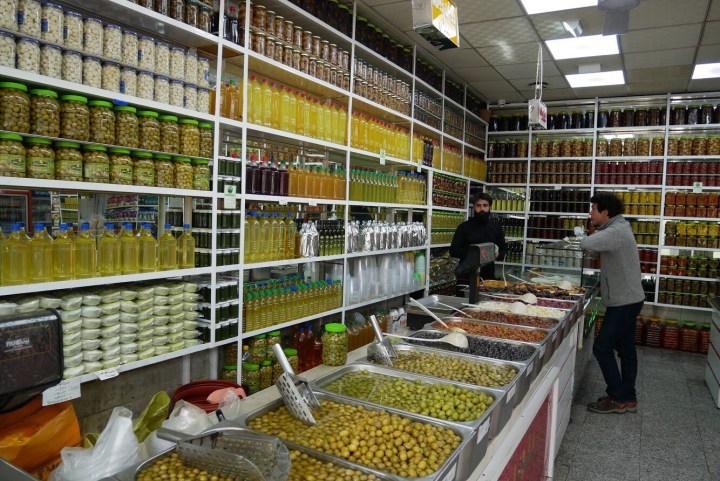 L’huile est complètement rance et nous l’avons bien étalée partout sur nos mains, pour en profiter toute la journée… Nous goûtons d’autres huiles dans d’autres boutiques et elles sont toutes rances, même celles de la récolte d’octobre 2018. Vues les conditions de conservation, ce n’est pas étonnant : les contenants sont en général des bouteilles plastiques transparentes, qui exposent le précieux liquide à la lumière. De plus, les bouteilles et bidons sont placées au soleil, sur le trottoir, pour attirer le chaland. Outre la lumière, la chaleur fait rapidement tourner l’huile. Bref, nous préférons acheter de délicieuses olives Parvadeh, une recette locale d’olives aux noix et à la grenade.