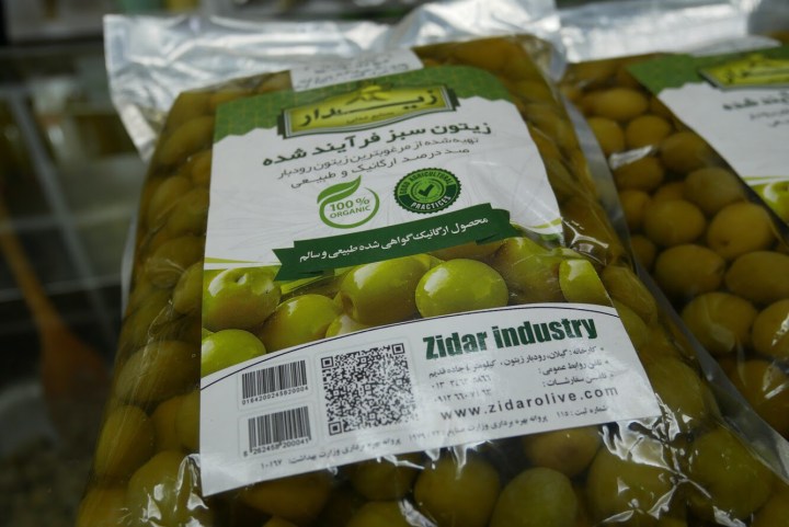 Pavdan – Disons que 30% de notre récolte d’olives est utilisée pour l’huile d’olive, tandis que le reste est transformé en olives de table. Nous produisons deux types d’huile d’olive : les 100% olives et les mélanges avec des huiles de graines. Nous avons deux huiles d’olive pures, regardez l’étiquette de celle-ci : « extra vierge » et « pressée à froid ». C’est un bon produit issu d’un mélange de variétés. Nous avons aussi une très bonne huile d’olive de Mari, une variété iranienne. Ces huiles d’olive sont fraîches de la saison dernière, à peine cinq mois.