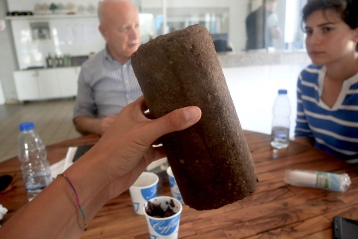 Une autre machine sert à peler et dénoyauter les olives, pour faire de la pâte d’olive, une sorte de tapenade 100% olives très finement moulue. Une autre machine encore permet de filtrer les grignons issus de la presse des olives en nourriture pour les vaches ou chèvres. Mais la machine qui retient notre attention pour son originalité, est celle dédiée à la fabrication de bûches de grignons.