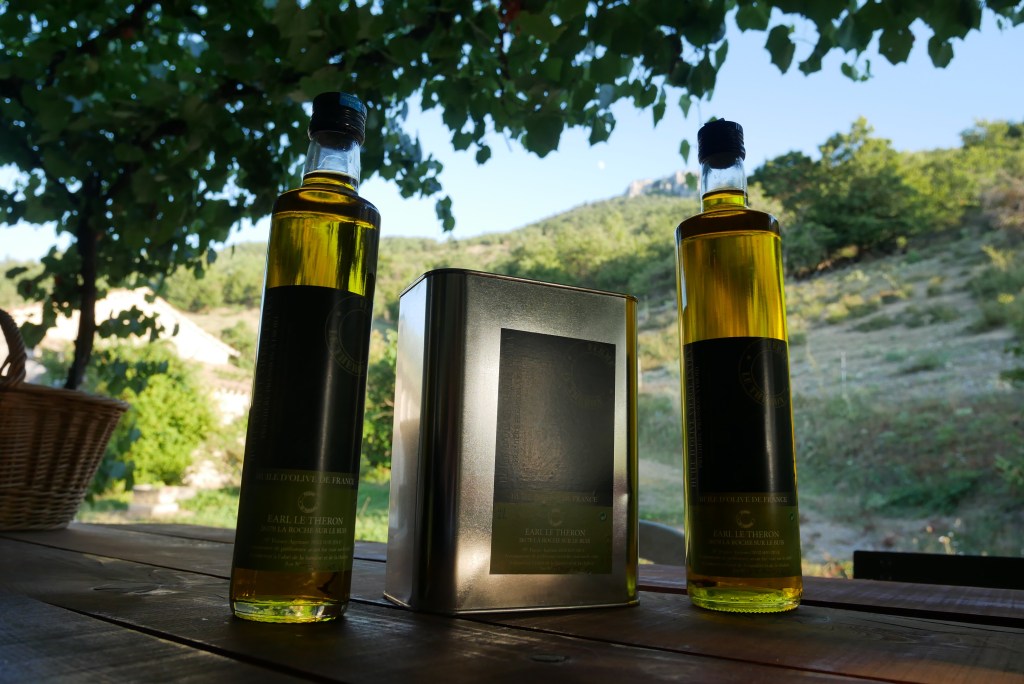 Climat local oblige, c’est la Tanche qui pousse avant tout ici. Marc et Cécile en cueillent un peu à la main pour leur réserve personnelle d’olives de table, mais la majorité de la récolte se fait désormais avec des filets et de lourds secoueurs de branches avant d’être portée au moulin de la coopérative de Nyons ou celui de Buis-les-Baronnies. Cécile s’arrange tout de même pour récupérer une partie de la production d’huile, qu’elle vend ensuite tout au long de l’année, soit dans sa fromagerie sur la ferme, soit sur les marchés du coin qu’elle arpente tous les samedis.