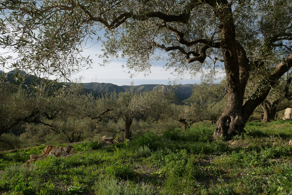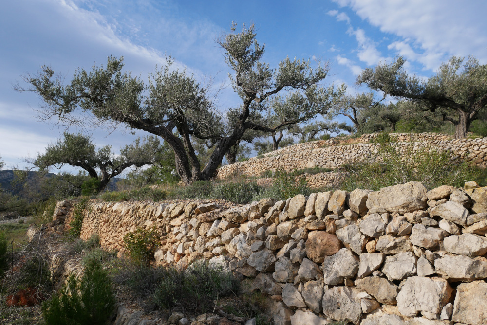 Grâce à ce soin vert, les oliviers de la Cova Fumada sont rayonnants. Ils ont le port large, les troncs noueux et leurs feuilles dansent sous la légère brise qui remonte du Delta de l’Ebre. A première vue, nous leur donnons au moins 100 ans. Un siècle qu’ils trônent sur leurs terrasses, qui s’élèvent sur tout le pan de montagne à plus de 500 mètres d’altitude. Ces belles terrasses de pierre font le charme des oliveraies de la région, mais aussi le calvaire des oléiculteurs, qui ne peuvent pas mécaniser leur culture. La récolte au filet en octobre requiert beaucoup de main d’œuvre et la taille en mars est un véritable jeu d’acrobate.