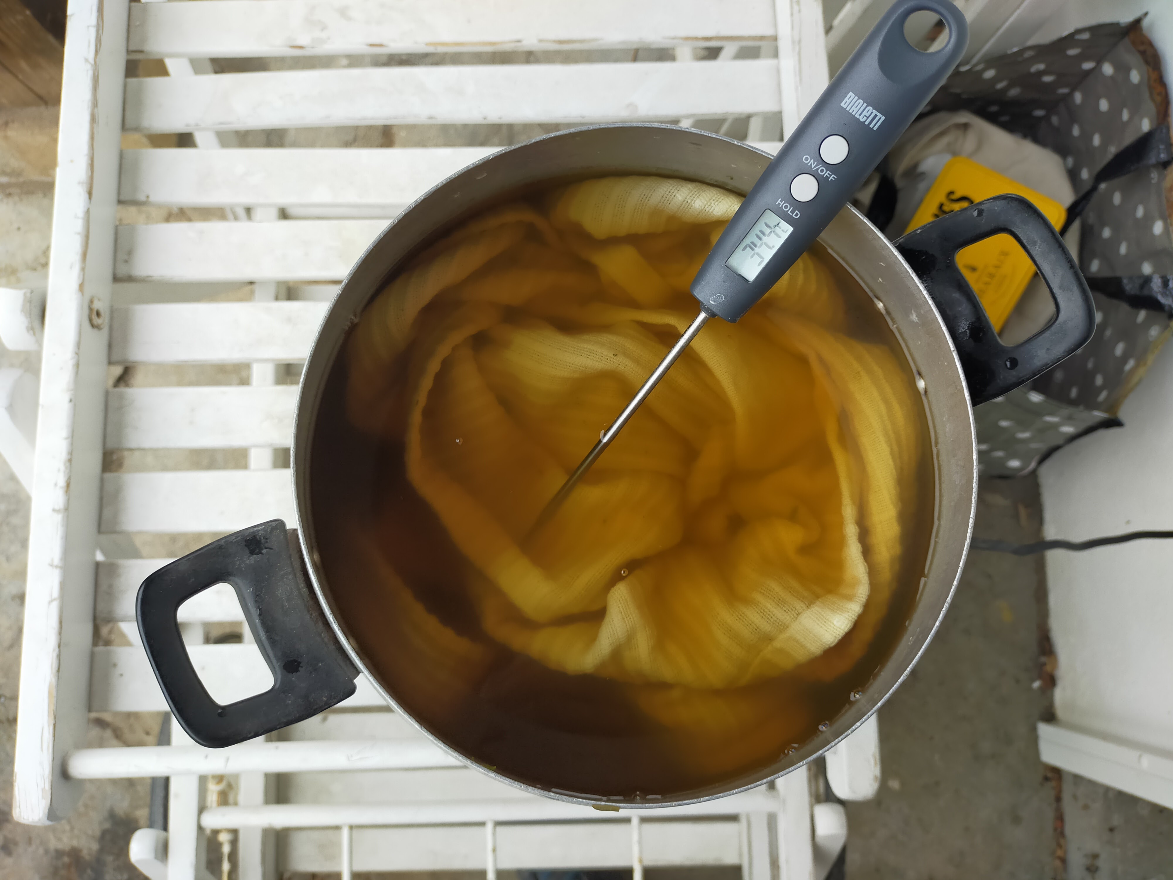 7/ PRÉPARATION DU BAIN DE TEINTURE : faites infuser les feuilles Ă  froid pendant 24h ou faites une dĂ©coction Ă  60-80°C pendant 2h. Nous avons optĂ© pour la version Ă  chaud pendant 2h ! Le bain devient jaune / ocre. Filtrez et remettez le liquide dans la marmite.