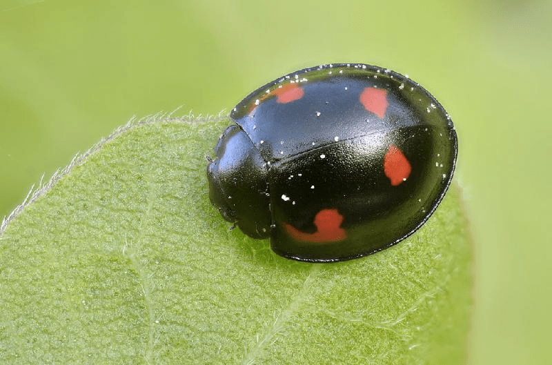 Les coccinelles coccidiphages (= qui mangent des cocchenilles) : trois espèces nous intéressent particulièrement, Chilocorus bipustulatus et Exochomus quadripustulatus – la coccinelle à virgules – petites et noires à points rouges, et Rhizobius encore plus petite et brun foncé. Et elles sont voraces : une larve âgée ou une femelle en période de ponte, peuvent consommer jusqu’à 40 larves de cochenille noire par jour ! Bon appétit !