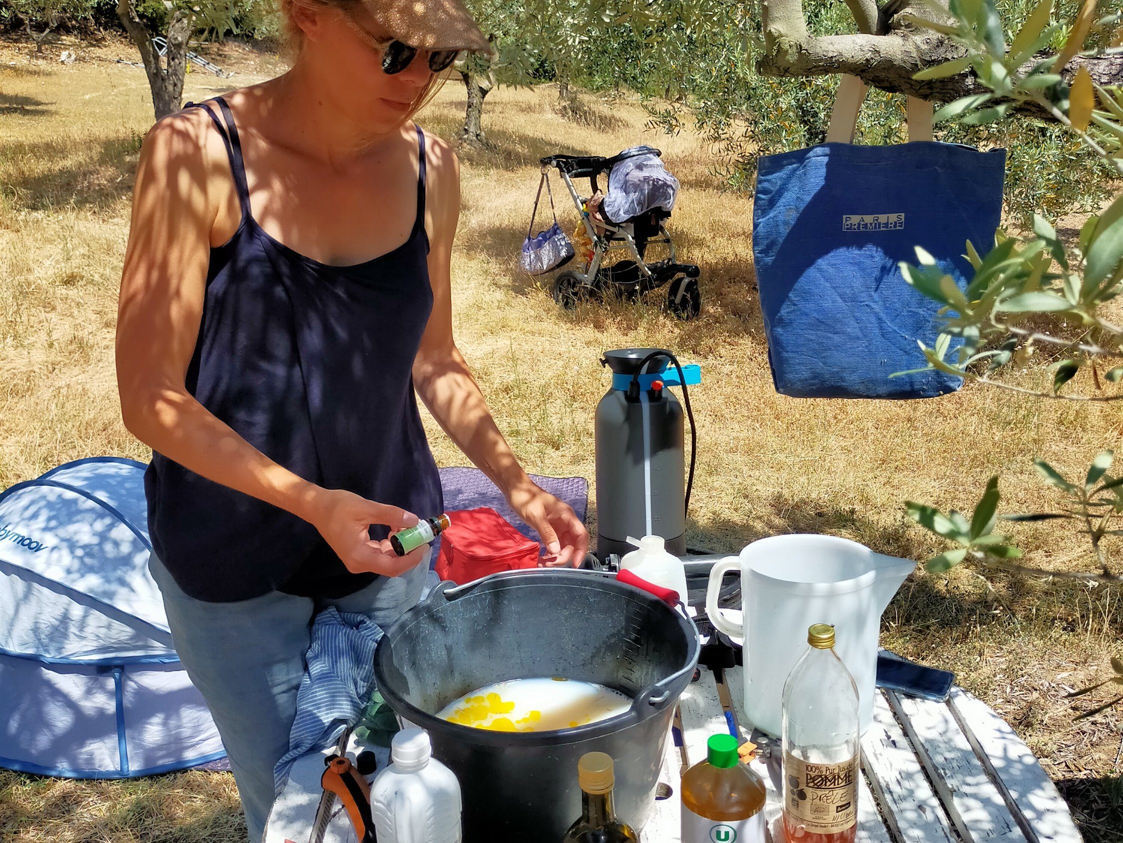 À plus long terme, une taille régulière des oliviers permet une bonne aération des arbres et donc de limiter la diffusion des champignons et de la fumagine. Pour lutter contre cette dernière, on peut également appliquer un traitement anti-fongique après la taille. En plus de l’application de 1/4 de dose de cuivre après la taille de mars, étant donné que cette année est particulièrement sèche (déficit de pluie de 75% en mai 2022), nous n’avons pas remis de cuivre après avoir coupé les branches infestées de cochenille, mais opté pour une décoction de prêle (à appliquer le soir pour éviter l’exposition au soleil).