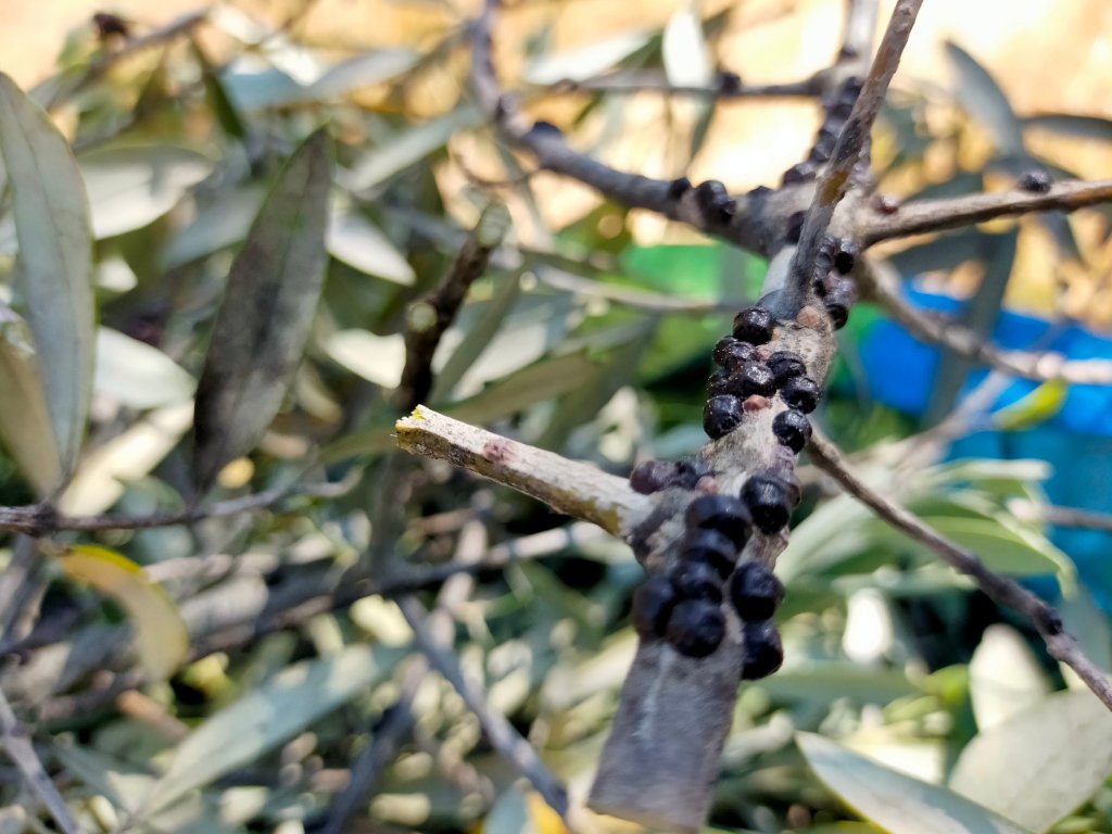 Comment reconnaître cette vilaine cochenille ? On repère la femelle adulte par une coque noire de 3 à 4 mm de diamètre marquée d’un H sur le dos, collée sur les tiges ou les feuilles des jeunes rameaux d’olivier. Les femelles pondent une fois par an, de mai à août, jusqu’à 1000 œufs de couleur orangée, situés sous leur bouclier-carapace. Les larves, brun clair, mesurent 1,5 mm à leur dernier des trois stades de développement et se déplacent pour se fixer sur la face inférieure des feuilles entre juin et août. On repère aussi – et surtout – les branches noircies par la fumagine (beurk) et les fourmis qui rodent autour des carapaces noires pour les protéger des prédateurs et ainsi bénéficier du miellat qu’elles sécrètent… un mariage pour le pire !