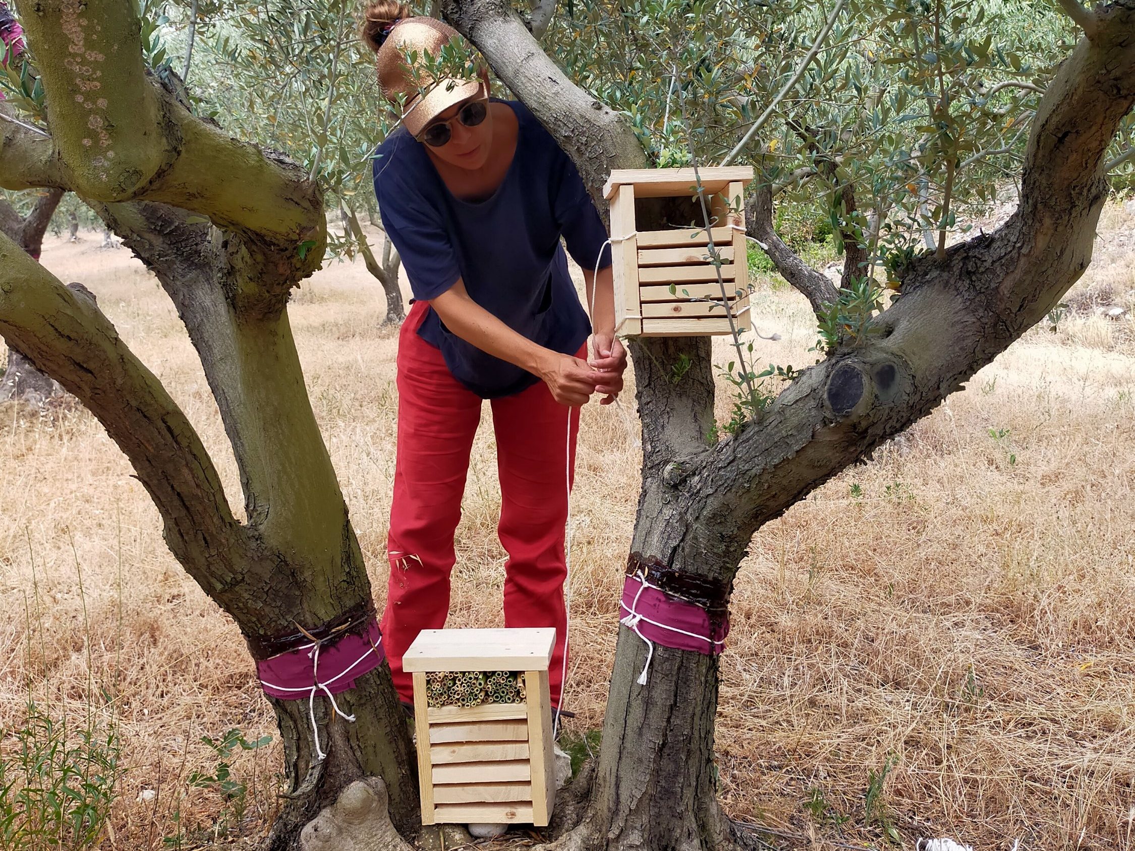 L’idéal est de les attirer naturellement en créant un écosystème propice. Pour ce faire, nous avons installé dans notre oliveraie plusieurs hôtels à coccinelles. Mais il faut parfois attendre jusqu’à 3 ans avant qu’une colonie de coccinelle ne s’y installe, en espérant que ce soit la bonne variété… De plus, certaines plantes semblent attirer ces auxiliaires, comme le romarin, le thym, la lavande ou le ciste blanc (abri hivernal), mais aussi le figuier, le chêne vert ou le cade. Nous allons donc réaménager et planter la bordure de notre parcelle, pour en faire un réservoir d’auxiliaires !