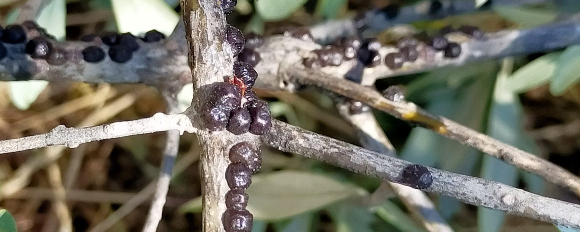 La cochenille noire de l’olivier – Saissetia oleae de son petit nom latin – est un insecte polyphage de l’ordre des hémiptères (comme les cigales, les pucerons ou les punaises), qui s’attaque à un grand nombre de plantes sauvages et cultivées, dont les agrumes, le figuier et l’olivier. Elle n’occasionne pas de dégâts directs sur les plantes infestées, mais elle les affaiblit en se nourrissant de leur sève et en sécrétant sur les feuilles et les rameaux un miellat qui favorise le développement de la fumagine, un champignon formant une couche noire qui limite la photosynthèse de la plante, voire asphyxie ses feuilles. Et ça, ça ne nous plait pas beaucoup !