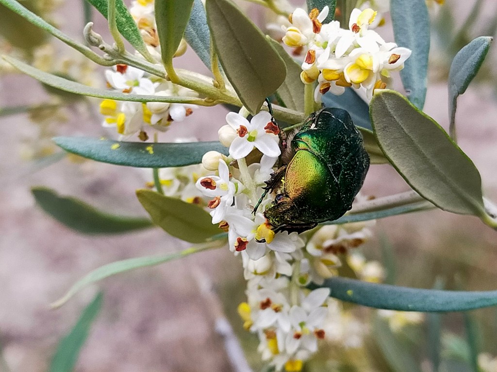 Avec un mois d’avril sec, trop sec, nous avions peur que la floraison soit très limitée. Heureusement, le mois de mai a été un peu plus humide et les oliviers ont trouvé les ressources nécessaire pour faire des fleurs. Si nous étions contents de voir enfin arriver la pluie, nous avons commencé à pleurer quand celle-ci s’est déchainée pendant les deux semaines de floraison (20 mai – 3 juin). Le comble après des mois sans une seule goutte ! Ceci combiné à l’absence de vent, nous nous attendions au pire en terme de pollinisation. Alors, remplis de l’énergie du désespoir, nous sommes allés secouer les oliviers, un par un, entre deux averses, pour que le pollen s’envole et féconde les oliviers environnant. Bilan : une pollinisation pas si mauvaise ! Un peu de millerandage (grappes de mini-olives qui ne se développerons pas), mais surtout une fructification réussie sur quasiment tous les oliviers. Ouf !