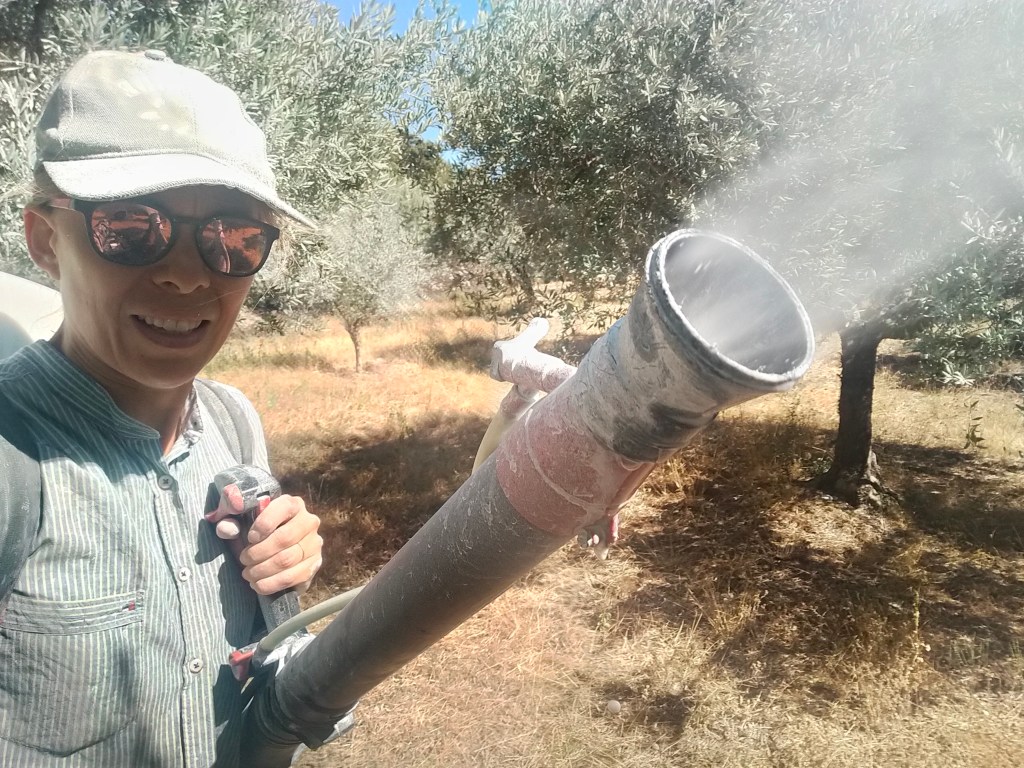 Les conditions climatiques de l’été ont été peu propices à la reproduction de la mouche de l’olive : les vols ont été assez rares dans le secteur et nos olives fripées étaient peu attractives. Mais nous avons malgré tout choisi de passer régulièrement de l’argile pour recouvrir les olives d’une fine pellicule protectrice. C’est probablement du zèle, qui nécessite du temps (une grosse journée avec le pulvérisateur à dos de 20kg sous le soleil de l’été…) et de l’argent (entre 40 et 70€ par passage selon la dose d’argile), mais nous ne voulions prendre aucun risque ! No pasaran ! C’est donc l’esprit tranquille que nous avons pu partir en vacances.